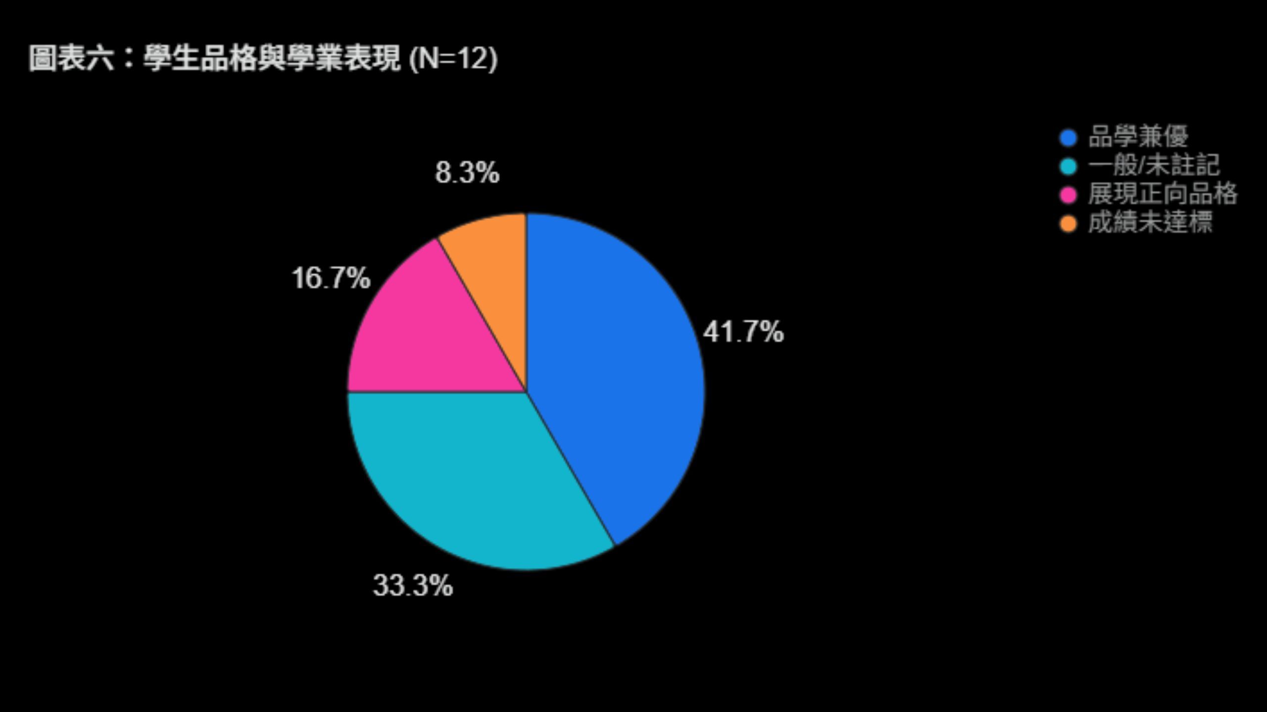在家訪的12位學生中,有 58.3% 展現了「品學兼優」或「正向品格」(如捐髮助人)的特質。更令人振奮的是,高達 91.7% 的孩子擁有明確的生涯興趣與夢想——他們想成為大提琴家、AI工程師、科學家、汽車設計師、獸醫或布袋戲操偶師。