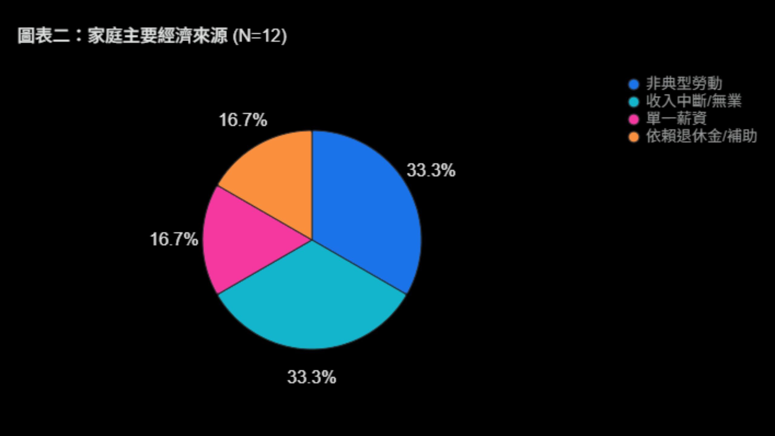 不穩定的經濟來源: 66.7% 的家庭依賴務農、零工或外送等非典型勞動,收入極度不穩;更有家庭因照顧者重病或官司纏身而導致收入完全中斷。