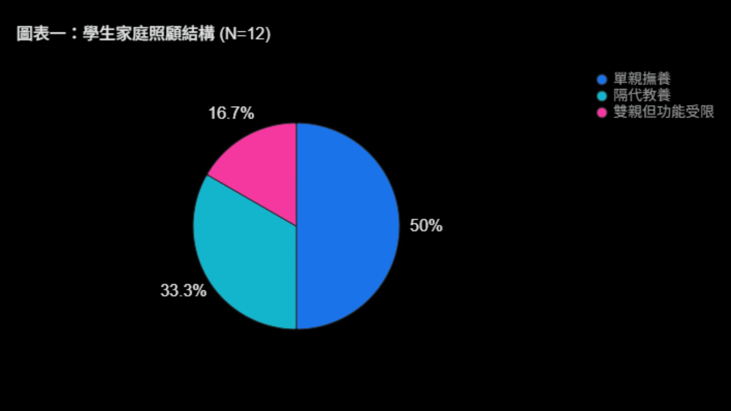 脆弱的照顧結構: 高達 83.3% 的家庭為單親或隔代教養。年邁的祖父母、獨自扛起重擔的單親家長,他們自身也常是需要被照顧的對象。