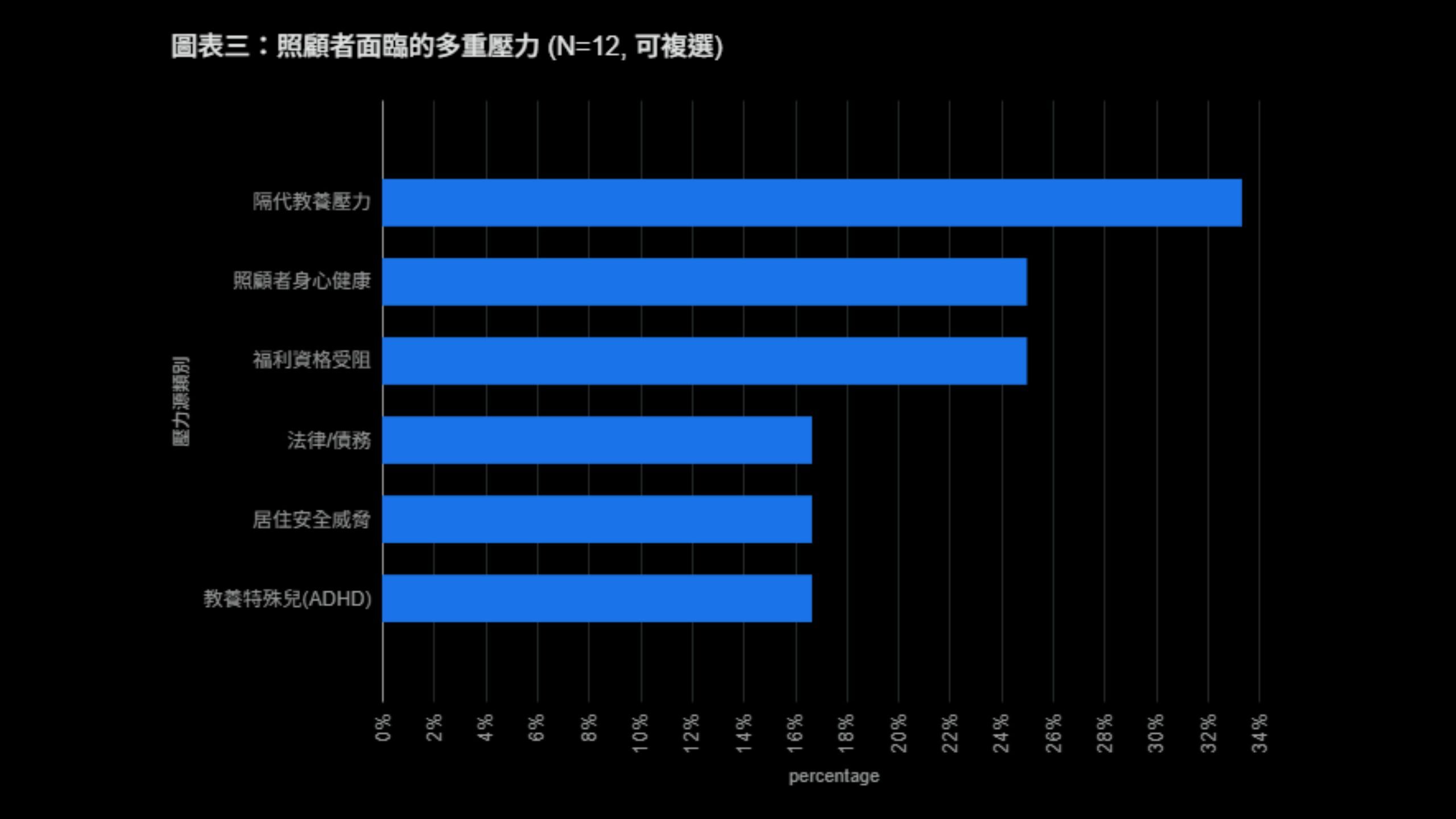 沉重的照顧者壓力: 「照顧者身心健康」、「法律債務」、「居住安全威脅」、「教養特殊兒(ADHD)」... 這些壓力源層層交疊,讓照顧者幾乎沒有喘息的空間。