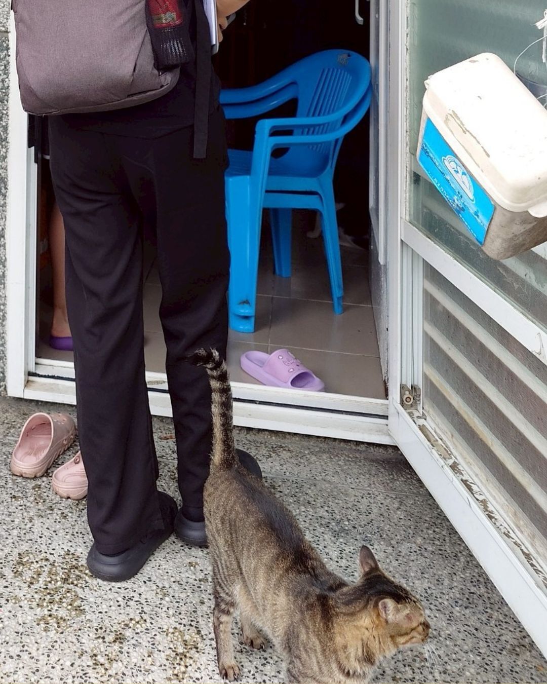 就在尷尬蔓延之際,一隻虎斑貓無聲地從屋內溜了出來,在訪視員腳邊蹭了一下。